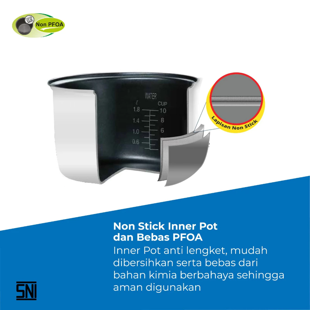 • Dilengkapi Thermostat System untuk menjaga nasi tetap hangat, tidak kering, dan tidak mudah basi