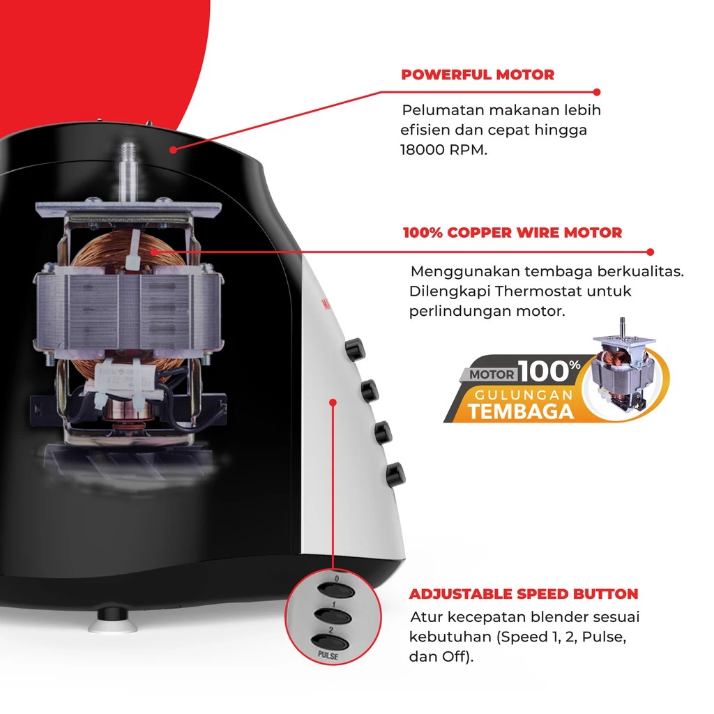 Perlindungan motor saat suhu berlebih untuk penggunaan yang lebih aman dan awet.
