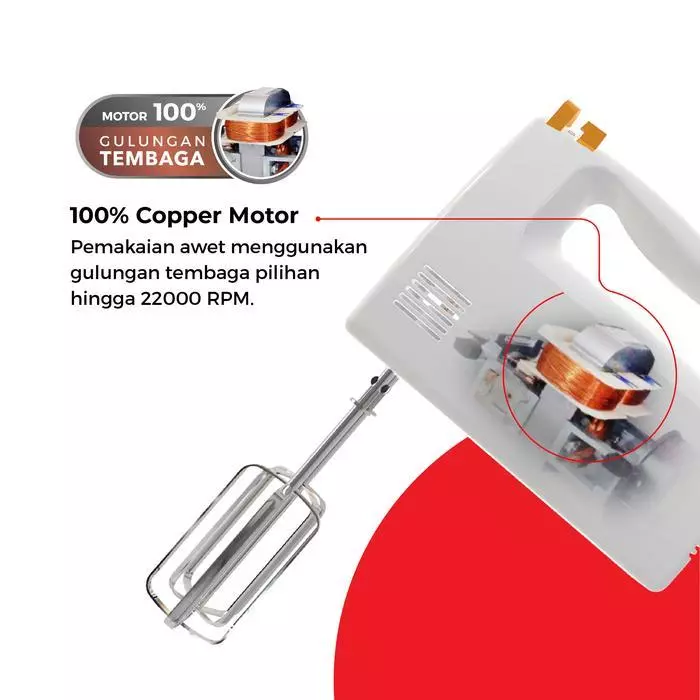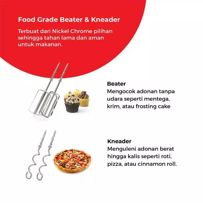 Dilengkapi desain beater & kneader inovatif untuk mencampur, mengocok, dan menguleni lebih optimal