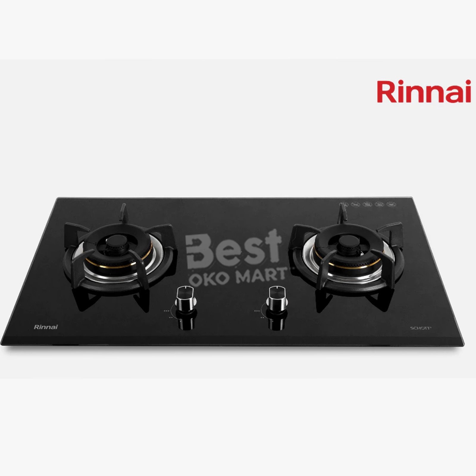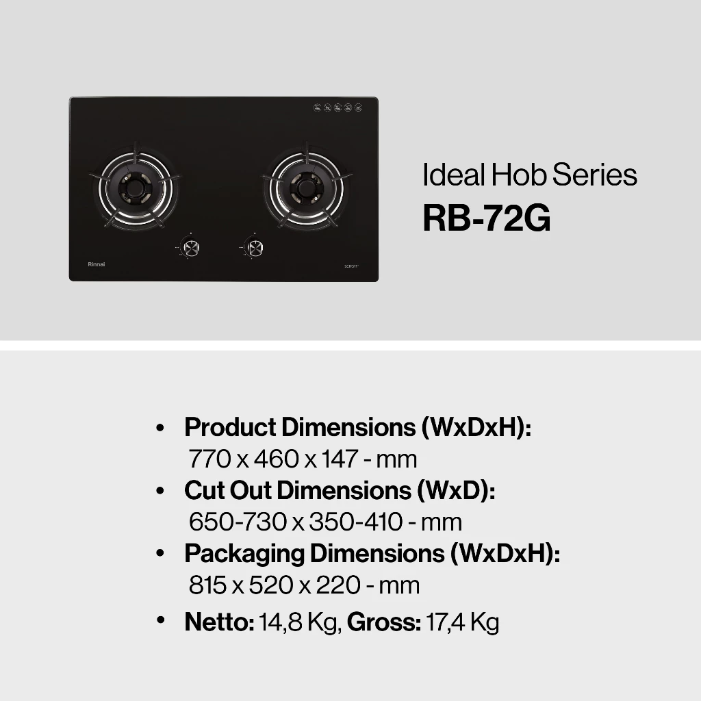 Kaca kompor menggunakan kaca tempered Schott dengan ketebalan 8 mm, tahan panas hingga 280°C, tahan benturan, dan mampu menahan beban hingga 100 kg.
