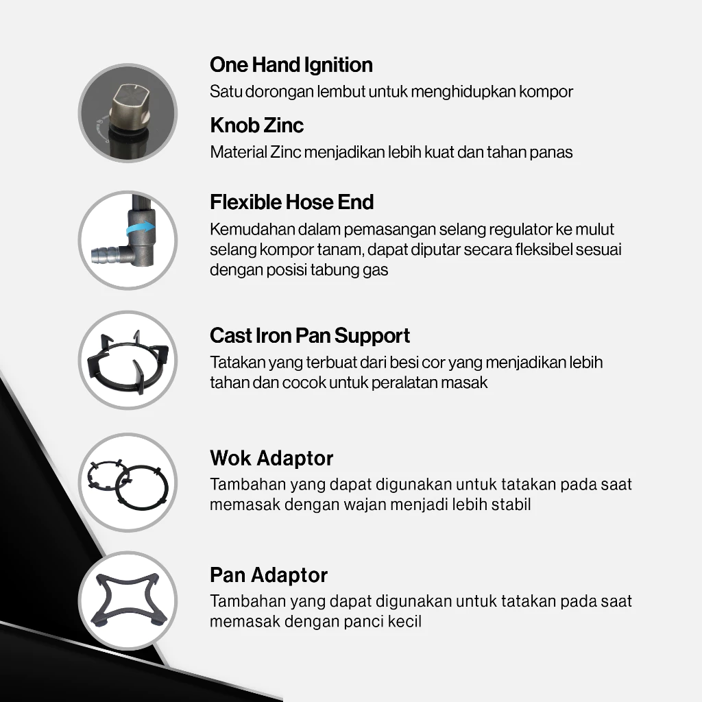 Dilengkapi extra wok adaptor sebagai tambahan tatakan saat memasak dengan wajan berbagai ukuran